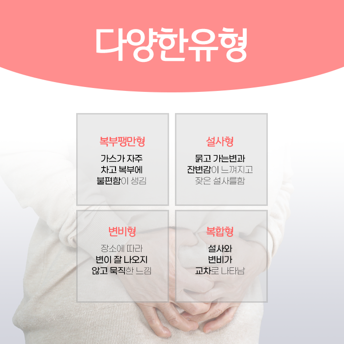 특징 중 하나로 배변활동을 마치면 복통이나 불편감이 어느 정도 해소되는 것을 느낄 수 있습니다. 하루에도 여러 차례 배변 활동을 하며 변의 형태가 묽거나 물과 같은 설사 양상을 보입니다. 가스형은 장내 가스가 제대로 배출되지 않거나 장 감각이 민감하여 가스에 대해 지나치게 불편감을 느끼는 경우로 풀이됩니다.