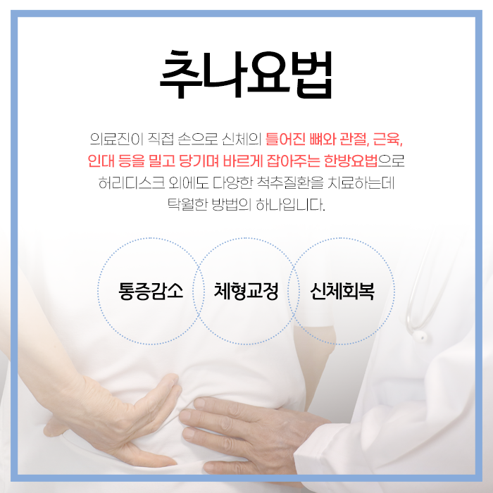 안산 허리디스크 한의원 추나요법은 허리디스크 관리를 위한 치료법 중 하나로 손을 이용해 척추, 관절, 근육의 균형을 맞추는 수기 치료법입니다.