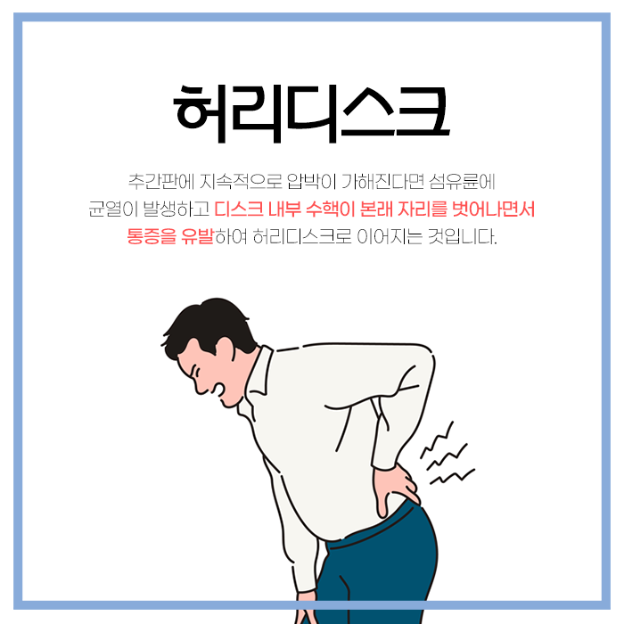 허리디스크는 척추뼈 사이에 위치한 추간판이라는 연골 조직이 변형되고 밀려나면서 주변 신경을 압박하는 상태를 의미합니다. 추간판은 반복적인 물리적 부하, 나쁜 자세, 무리한 활동 등이 원인이 되어 추간판이 쉽게 손상될 수 있습니다. 신경 압박이 발생하면 허리뿐 아니라 다리까지 통증과 저림, 당김 증상이 나타나며 증상이 심할 경우에는 발가락 끝까지 전해지는 방사통이 생길 수 있습니다.